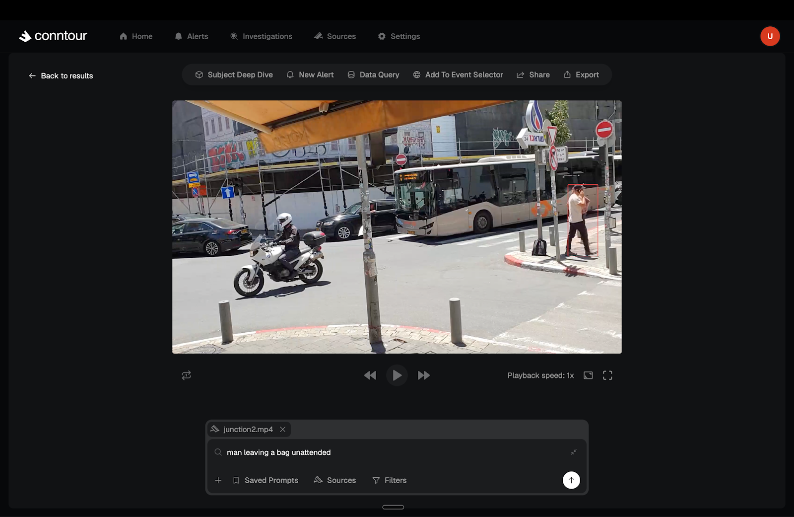 This is the type of problem Conntour is designed to solve. In the example below, a man places a bag on the ground and then walks away. Conntour detects this sequence of actions and triggers an alert in real time, allowing a human operator to intervene in a matter of seconds.